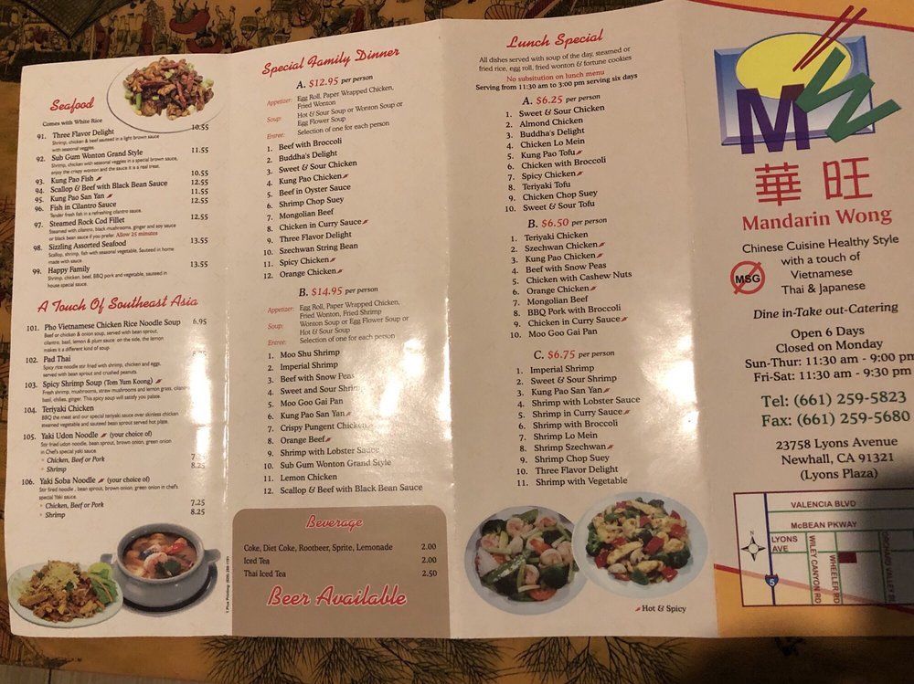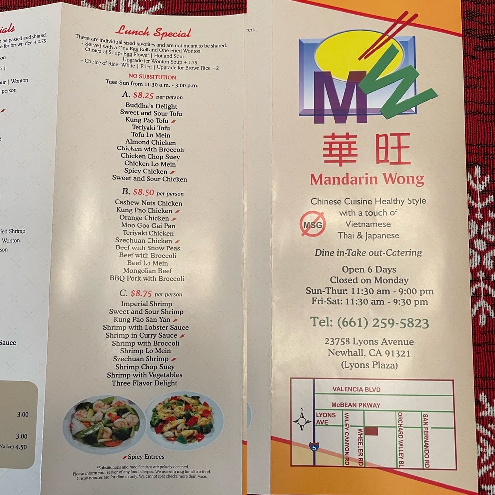 Introducing the menu at Mandarin Wong Chinese Restaurant, located in Santa Clarita, CA, a place known for its authentic Chinese cuisine. This establishment offers a wide range of options, including vegan and vegetarian dishes, making it a favorable choice for different dietary preferences. The restaurant provides a casual dining experience with options for takeout, delivery, and catering services. Customers have praised the flavorful dishes such as orange chicken, kung pao tofu, and pho, as well as the attentive service from the friendly staff. With a diverse menu including favorites like potstickers, lemon chicken, and egg drop soup, Mandarin Wong stands out in a sea of generic Chinese restaurants. For those seeking a taste of traditional Chinese flavors in a welcoming setting, Mandarin Wong is a must-try destination.